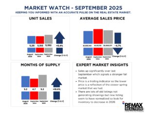 September’s interest rate cut was welcome news for homebuyers. With lower borrowing costs, more buyers were able to afford the monthly mortgage payments on a home that met their needs. The result was that 5,592 homes sold in the GTA, up by 8.5 per cent compared to September 2024 at an average price of $1,059,377. This now brings the YTD average price to $1,077,602, down 3.8% from the start of the year. It’s obvious now that the 20-30% price drop that some people were expecting or perhaps hoping for will not occur and as borrowing costs continue to drop, more buyers will enter the market, and the increased competition will start prices rising again.